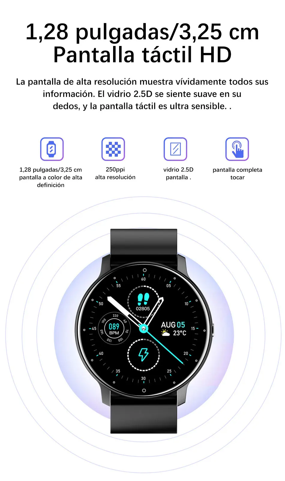 Pantalla: 1,28 “240*240 pantalla táctil completaBatería: Polímero de 220 mAhTamaño de la caja de embalaje: 15,1*7,5*3,0 cmBluetooth: 4,0Compatible con versión móvil: iOS 9,0 y superior a Android 5,0 y superior