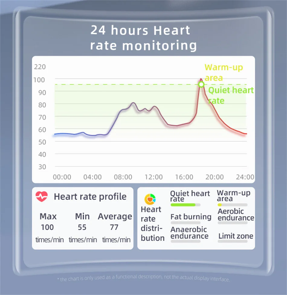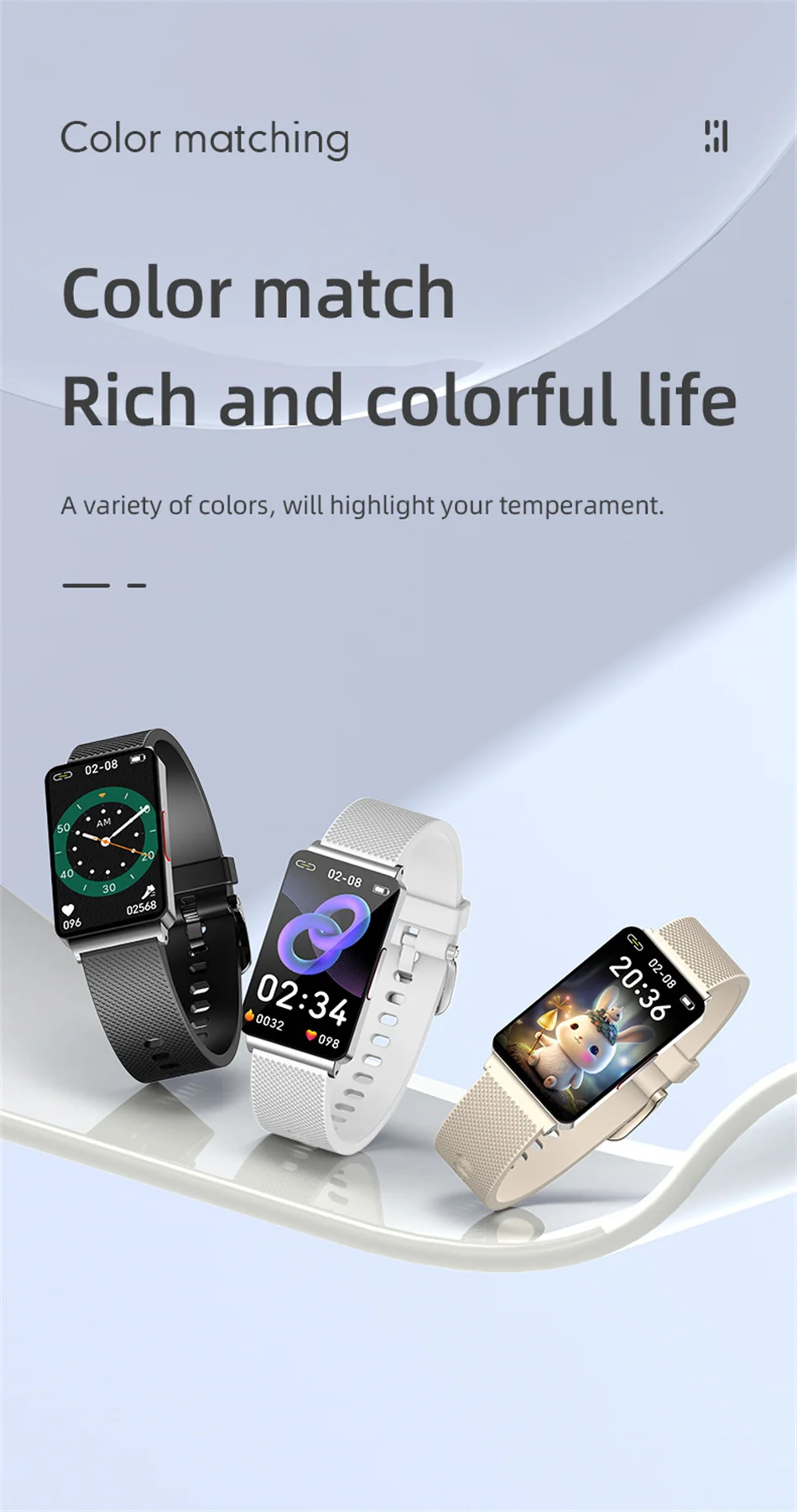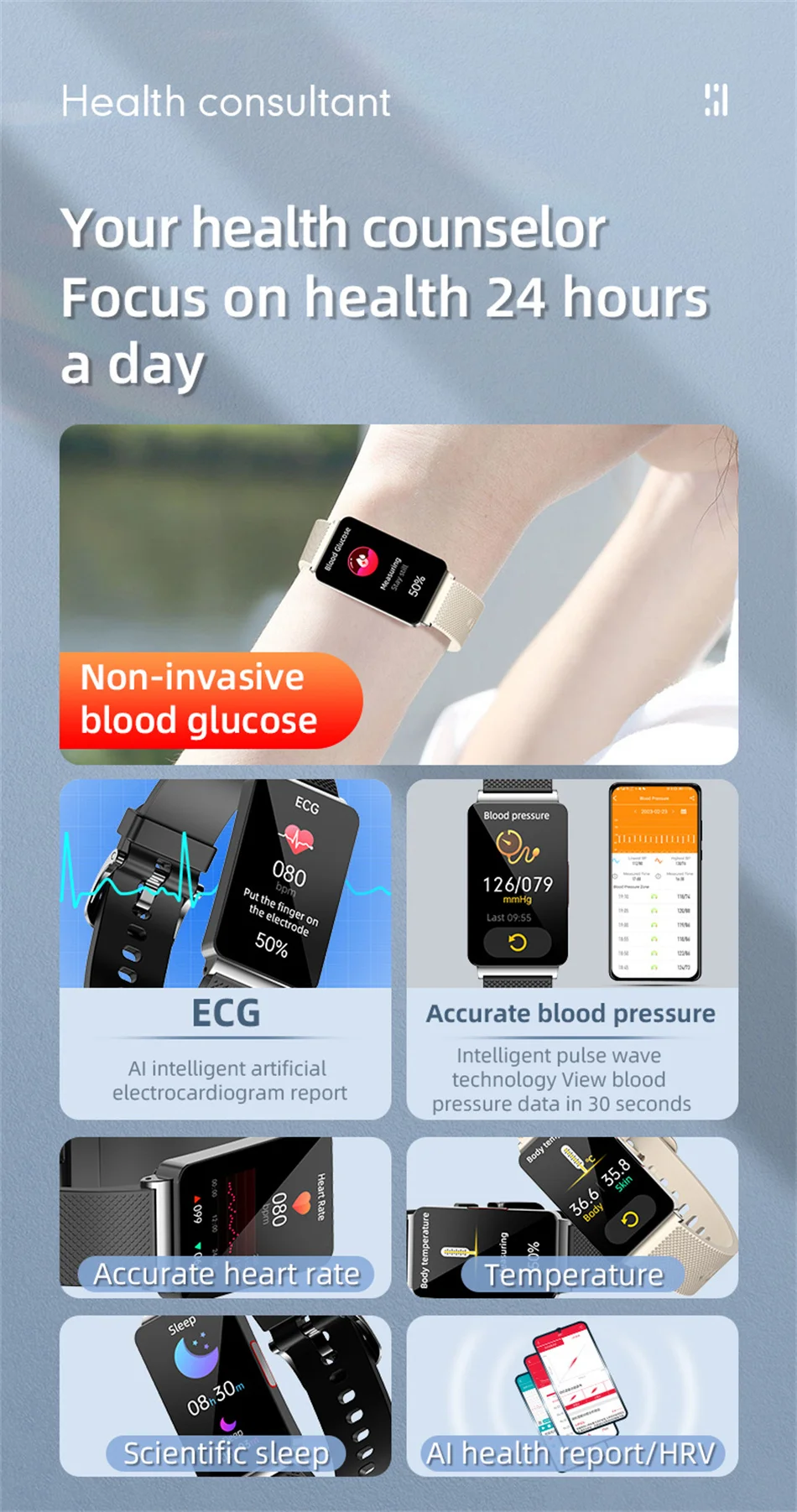 Oxígeno en sangre infrarrojo, sueño científico, diagrama de dispersión de Lorentz, monitoreo de frecuencia cardíaca, monitoreo de presión arterial, medición de glucosa en sangre, medición de temperatura, medición de ECG, notificación de mensajes meteorológicos, reloj despertador, cronómetro, temporizador, música, encuentre su teléfono, recordatorio de período femenino y ovulación, podómetro de cámara