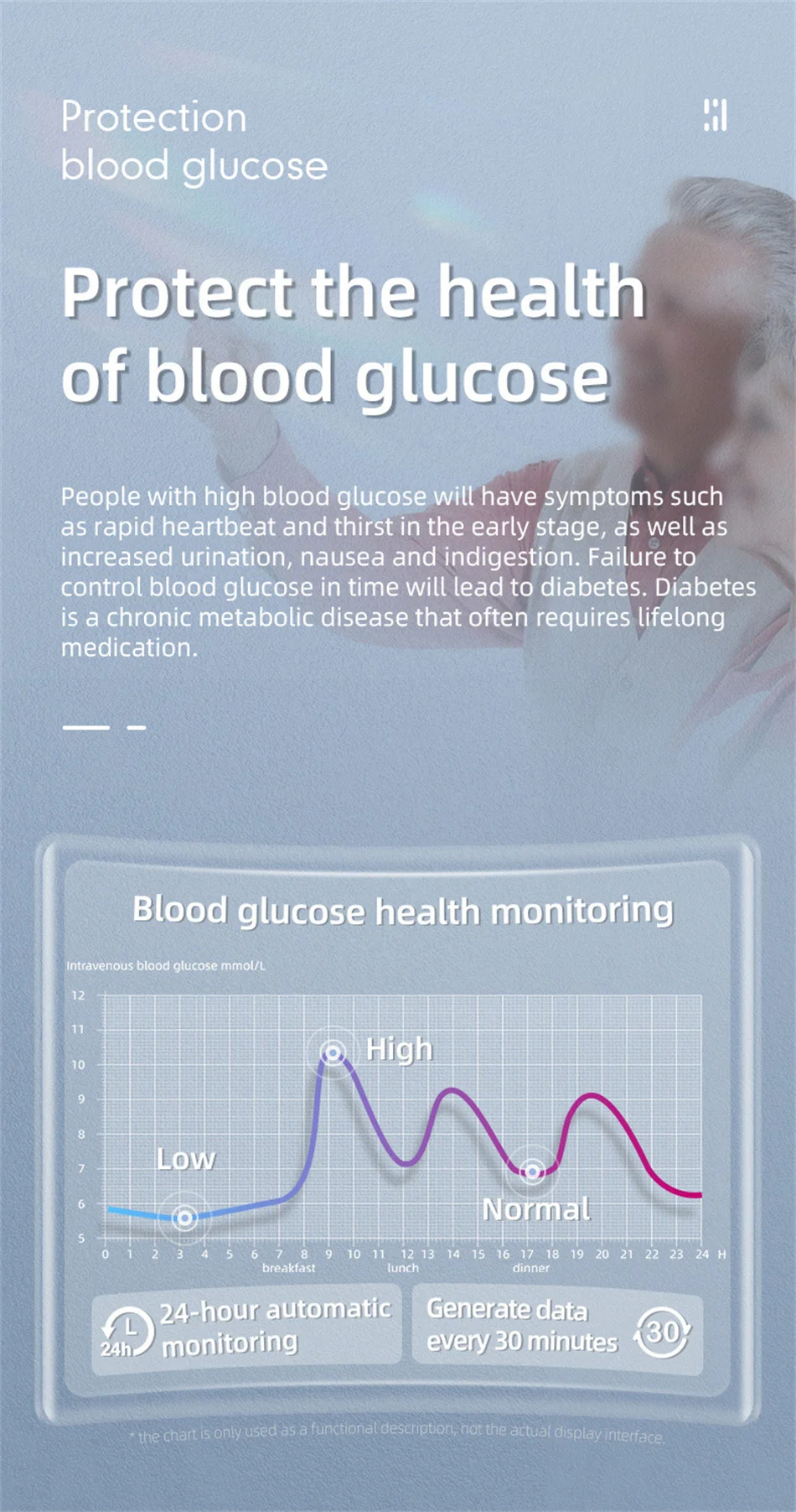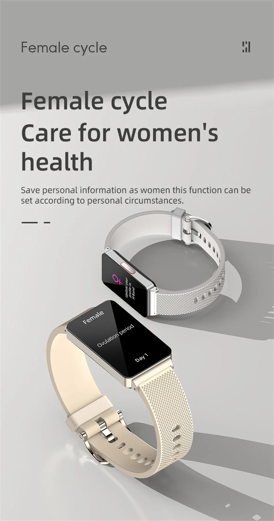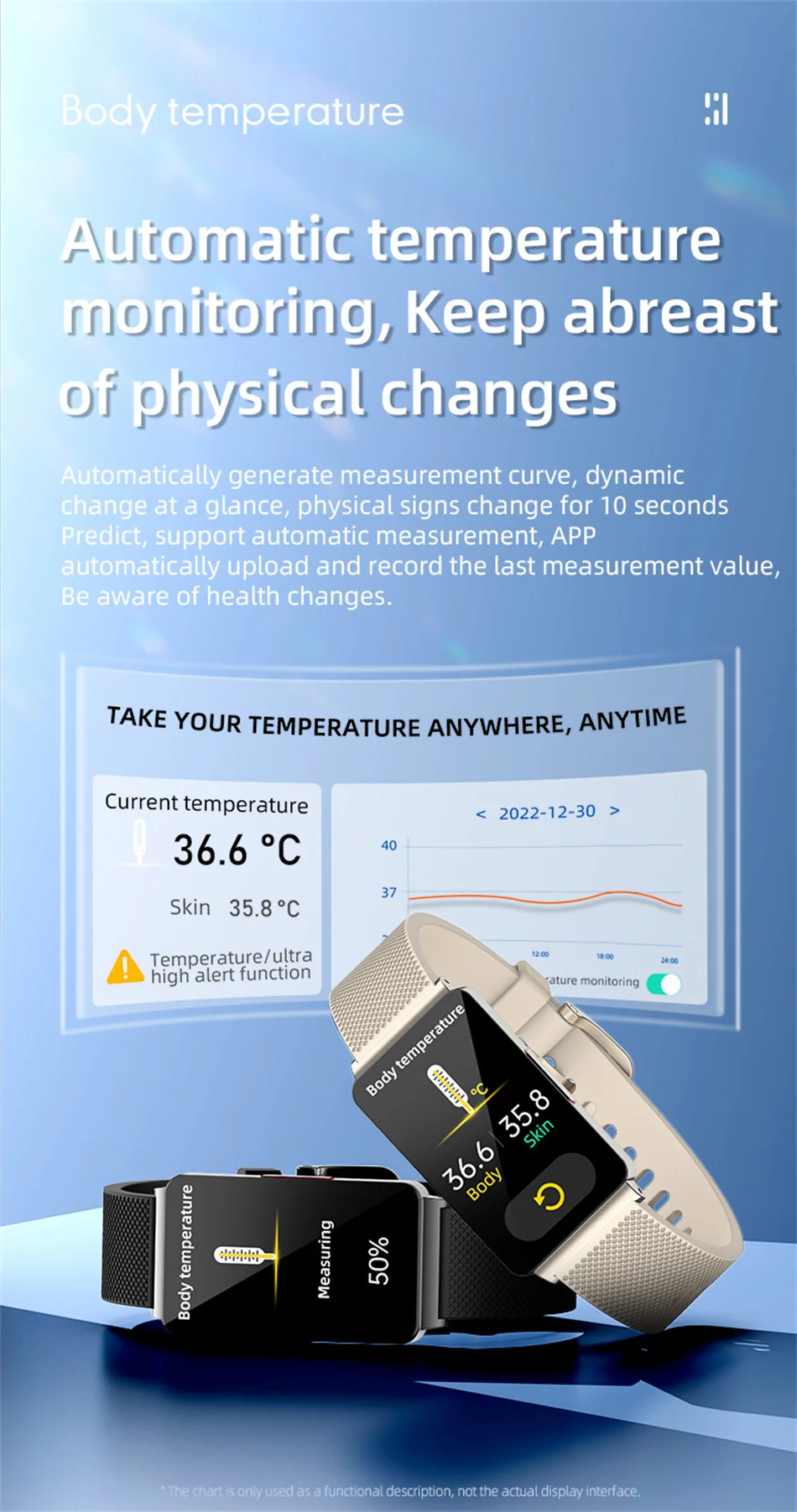 Oxígeno en sangre infrarrojo, sueño científico, diagrama de dispersión de Lorentz, monitoreo de frecuencia cardíaca, monitoreo de presión arterial, medición de glucosa en sangre, medición de temperatura, medición de ECG, notificación de mensajes meteorológicos, reloj despertador, cronómetro, temporizador, música, encuentre su teléfono, recordatorio de período femenino y ovulación, podómetro de cámara
